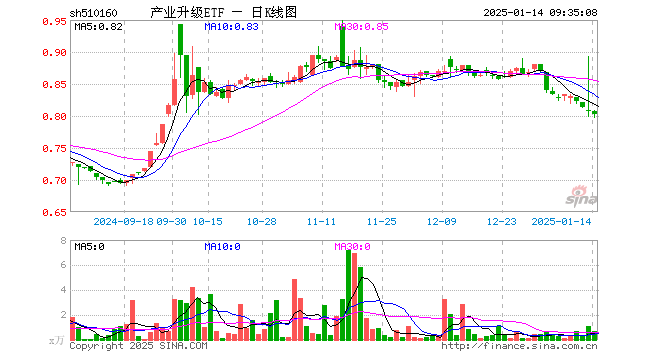 1月14日,产业升级ETF(510160)开盘涨0.00%,报0.807元。产业升级ETF(510160)重仓股方面,中国联通开盘涨0.21%,上汽集团涨0.06%,中国建筑涨0.00%,宝钢股份涨0.31%,交通银行涨0.41%,紫金矿业跌0.67%,伊利股份跌0.21%,海螺水泥跌0.50%,浦发银行涨0.30%,中国中铁涨0.17%。