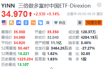 格隆汇5月2日|三倍做多富时中国ETF盘初涨近10%,纳斯达克中国金龙指数涨2.7%,阿里巴巴涨近5%,京东涨4%,小鹏汽车涨超6.5%,金山云涨超7%。