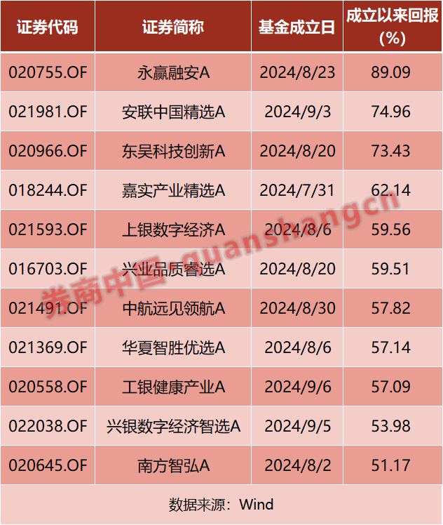 业绩方面,永赢融安成立于去年8月23日,截至今年9月26日收益率高达89%。此外,安联中国精选、东吴科技创新等产品涨超70%。另外,嘉实产业精选、上银数字经济、兴业品质睿选等其余8只产品收益率超过了50%。