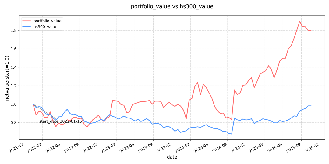 我用2022年1月15日到2025年10月4日做了个回测,使用的底层数据是用的2021年6月30日以来的,在计算因子的时候,选用的股票是市值小于200亿,最近12个月分红的股息率大于0,同时市盈率大于0小于100,进入因子计算和回归分析的是2000多只股票,得到的净值曲线和沪深300的比较如下图所示,基本跟大盘走势类似,但是波动会大一些。整个区间的收益率是80%,最大回撤是33%(区间是2024年4月到2024年9月),从收益计算开始,用了一年时间开始跑赢大盘,并在2024年9月跟着大盘开始大幅反弹,只是幅度更大一些,第一个区间(2024年9月21日到2024年10月5日)就达到了40%的涨幅。