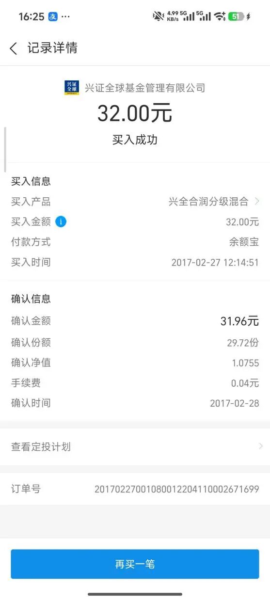 看基金成分就知道这个组合受望京博格影响挺大的,组合从创建到现在的净值是1.43,只有一个投资者(哈哈就是我自己买了1000块),但投资者的收益率只有1.21,因为我是组合创建了一年之后才买。