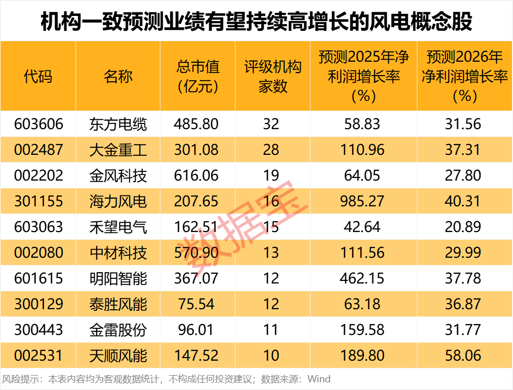机构看好风电板块长期发展前景,预测多股2025年、2026年业绩有望持续高增长。按照评级机构家数至少10家及以上,机构一致预测2025年、2026年净利润增幅均超20%筛选,有10只风电概念股入围。东方电缆获得32家机构评级,机构一致预测2025年、2026年净利润分别增长58.83%和31.56%。