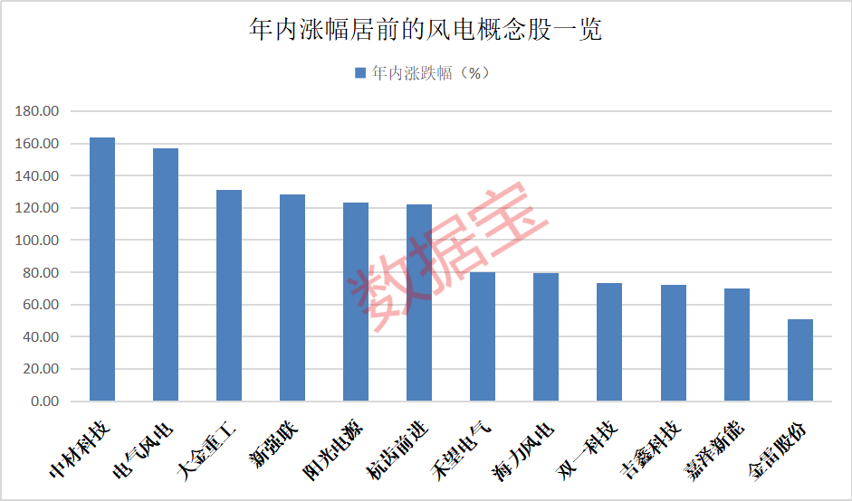 据证券时报·数据宝统计,近60只风电概念股今年年内股价平均上涨33.65%,仅7股年内股价录得下跌,不少概念股年内行情表现相当亮眼,股价实现翻倍。
