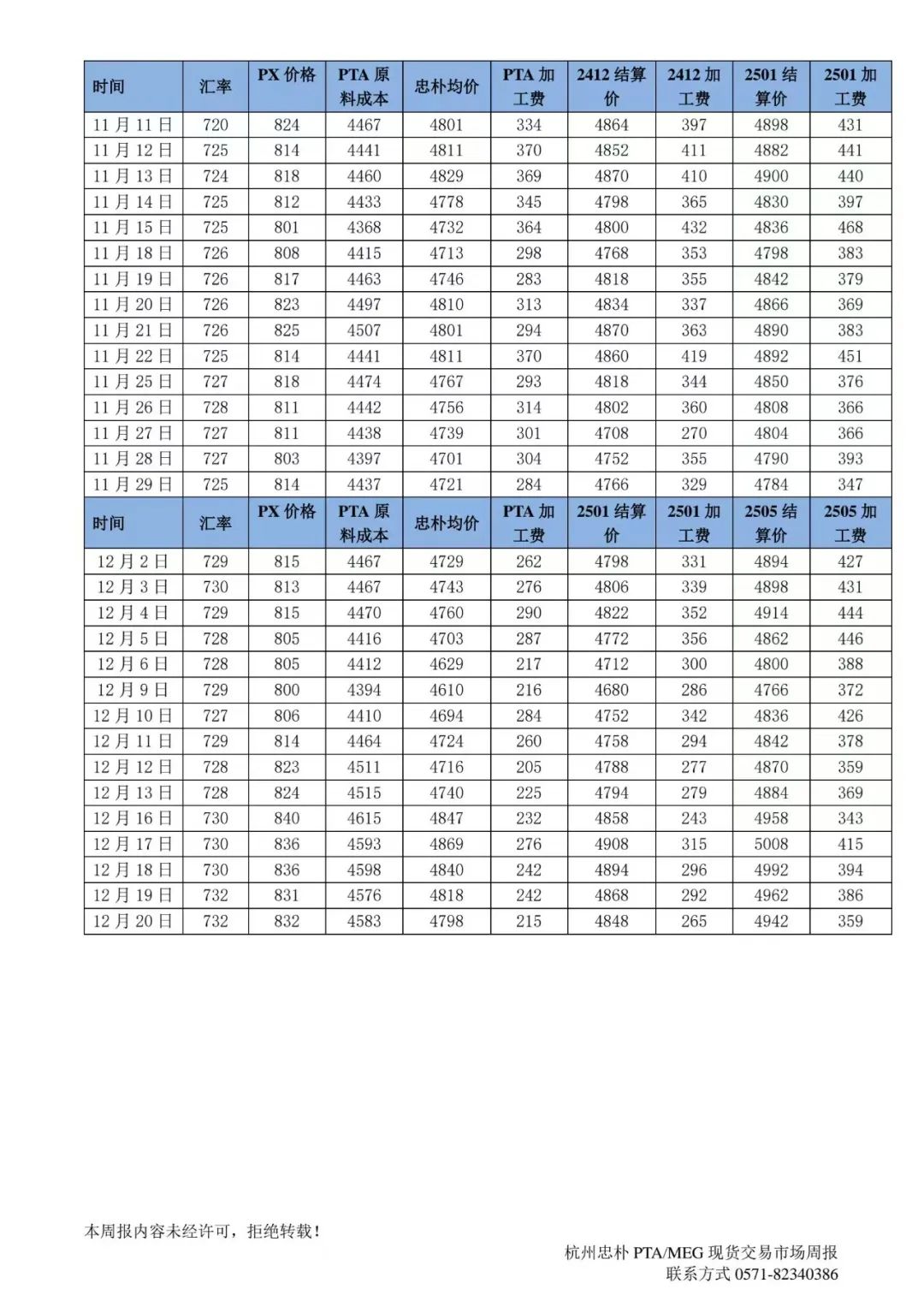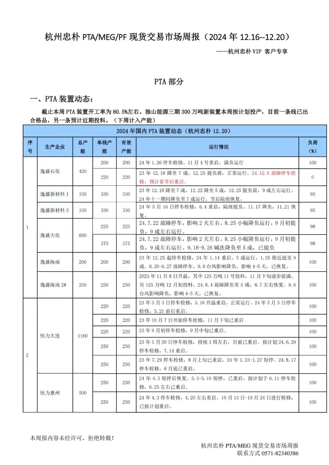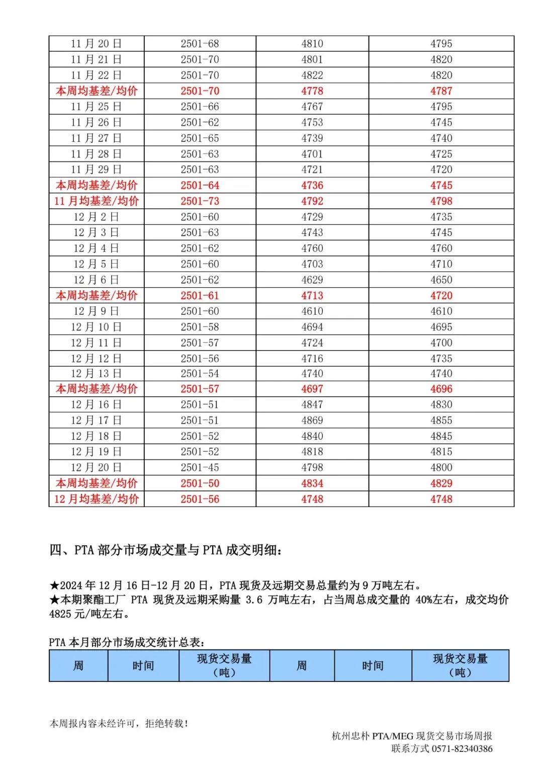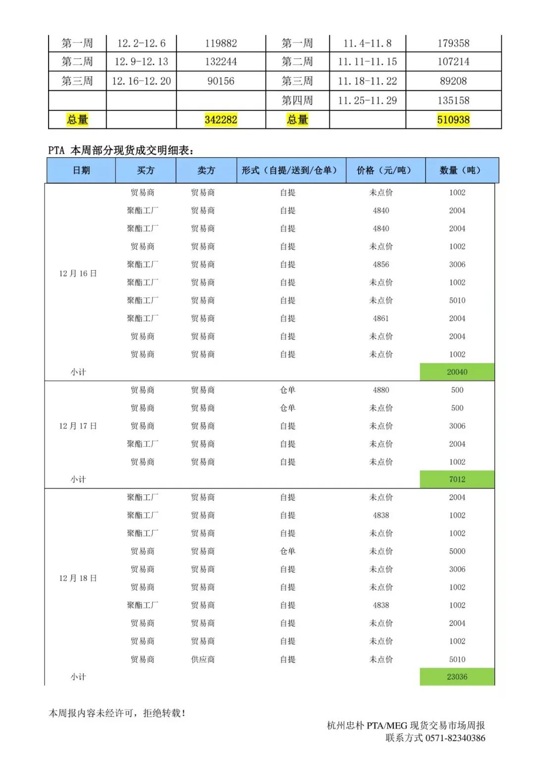 杭州忠朴PTA/MEG/PF现货交易市场周报(2024年12.16--12.20)