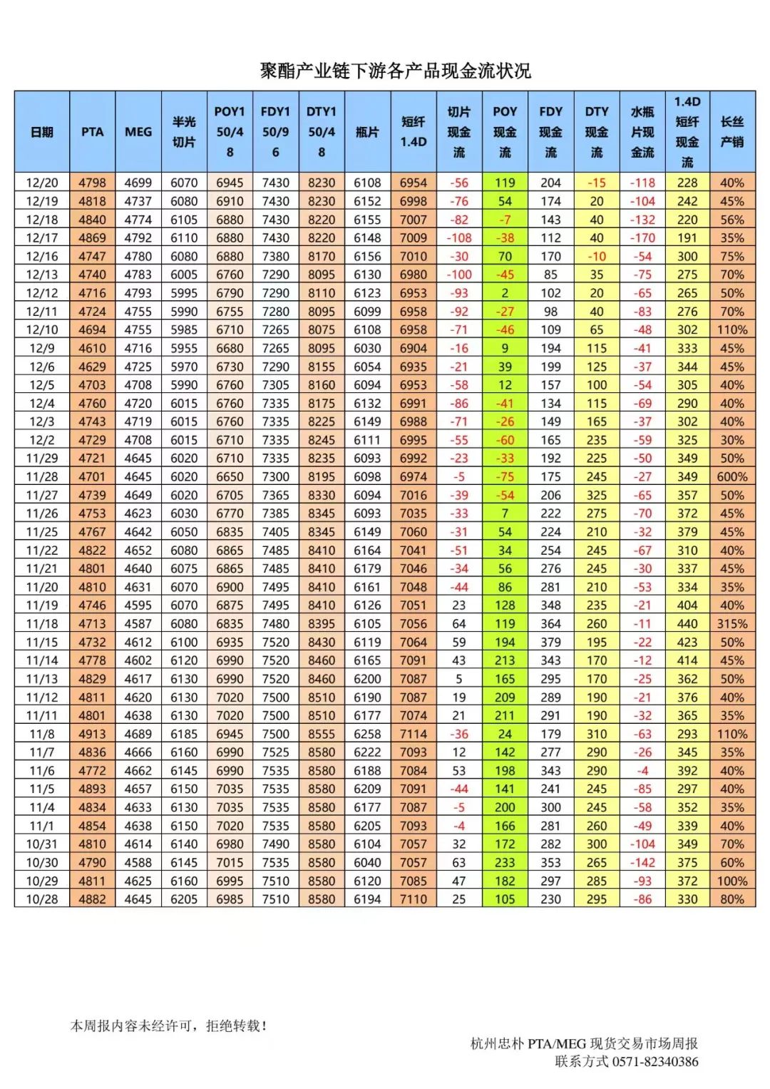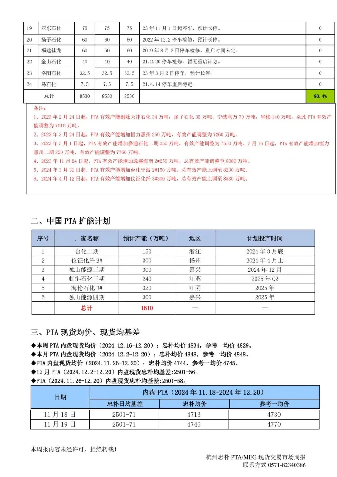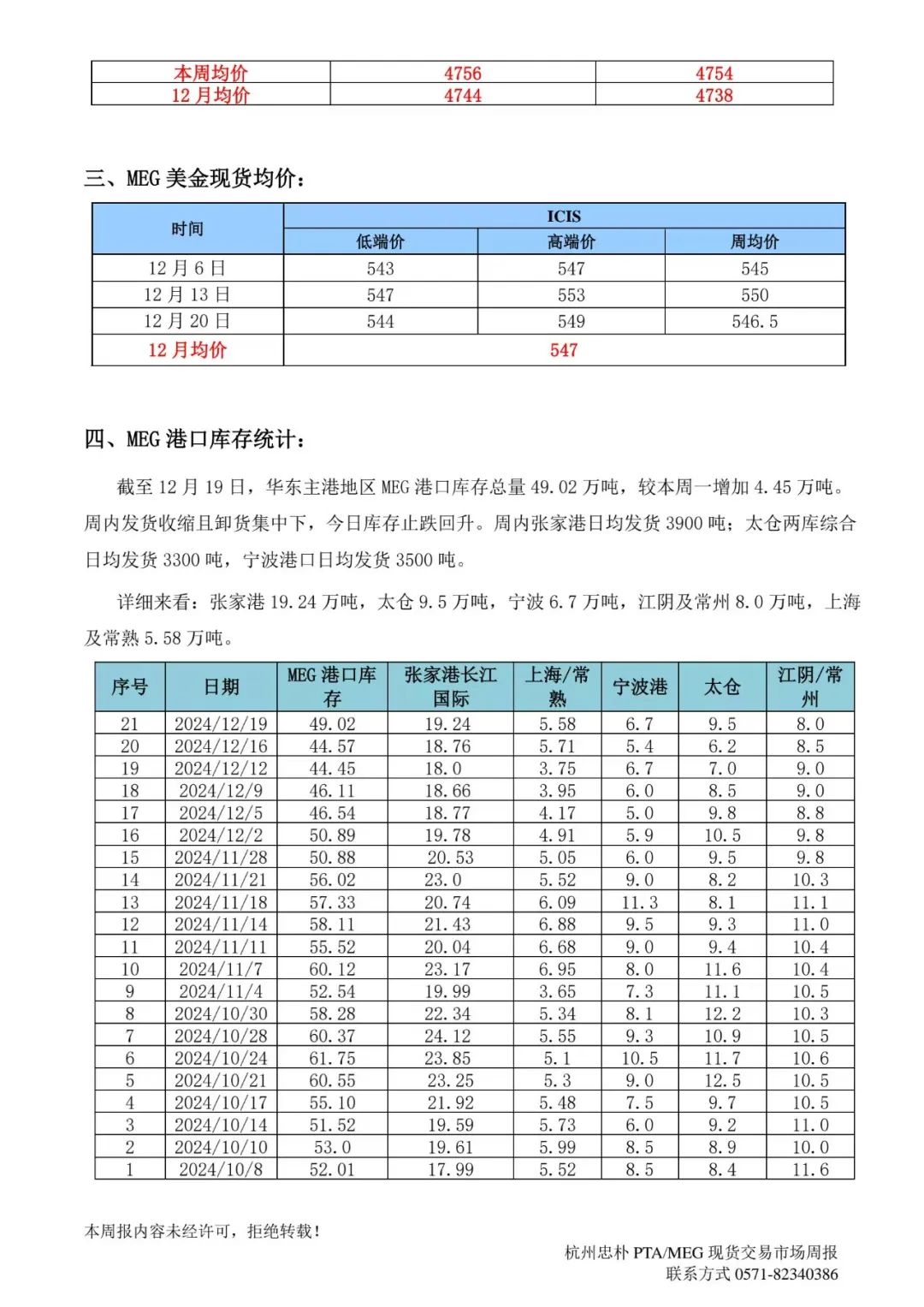 杭州忠朴PTA/MEG/PF现货交易市场周报(2024年12.16--12.20)