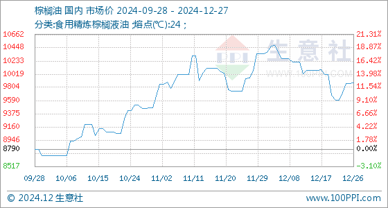 12月27日,生意社棕榈油基准价为9882.00元/吨,与本月初(10350.00元/吨)相比,下降了-4.52%。