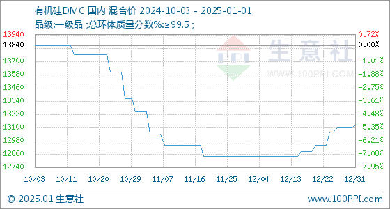 1月1日,生意社有机硅DMC基准价为13120.00元/吨,与上月初(12840.00元/吨)相比,上涨了2.18%。