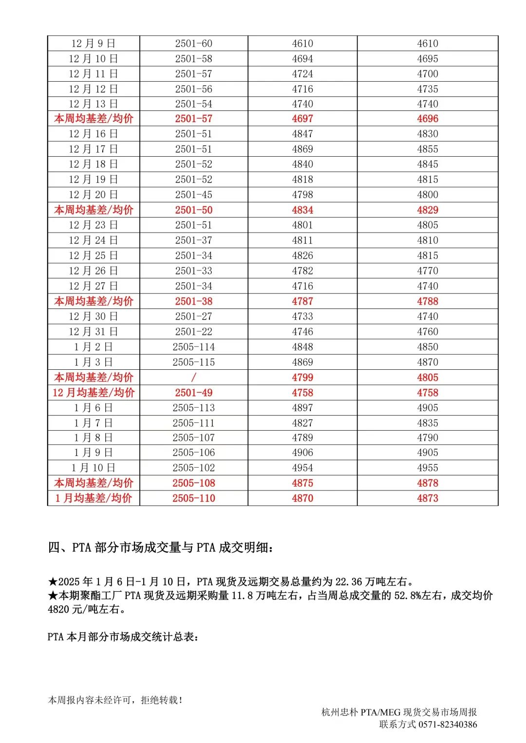 杭州忠朴 PTA/MEG/PF现货交易市场周报(2025 年1.6-1.10)