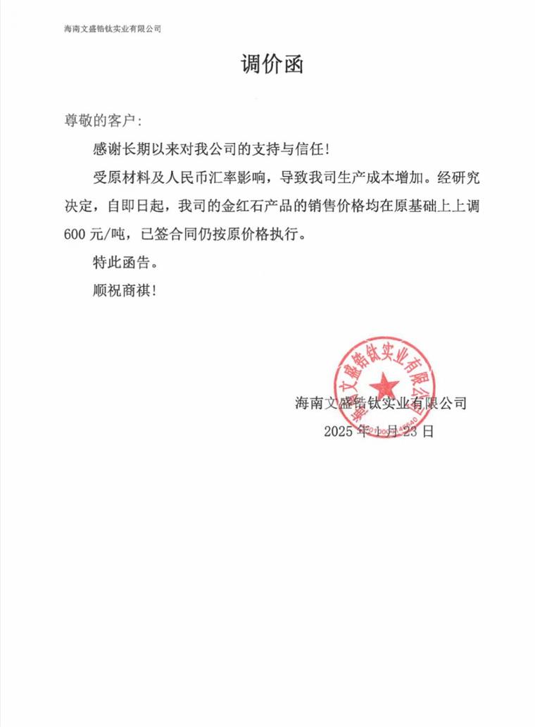 原标题:海南文盛发布金红石涨价函 来源:铁合金在线