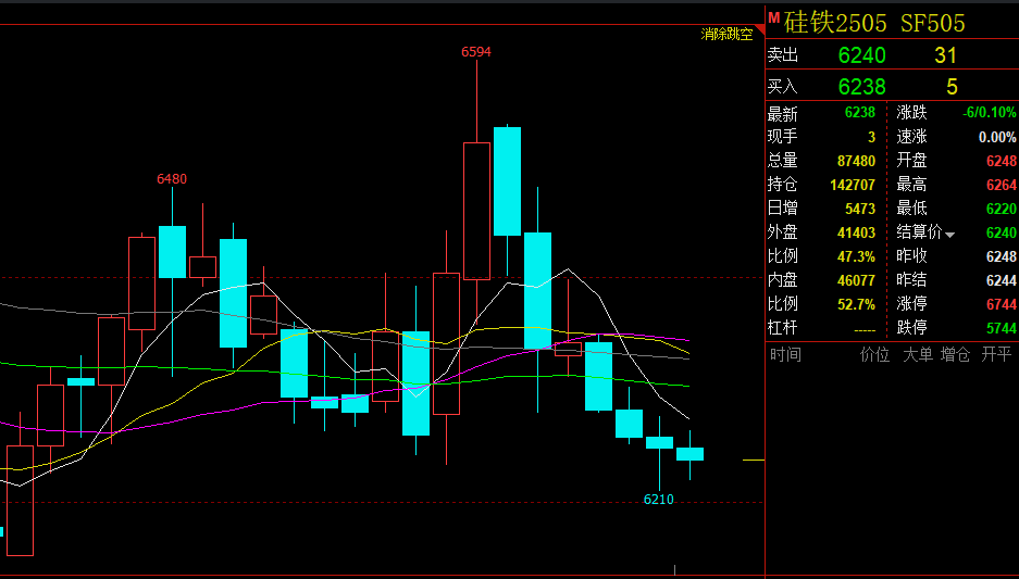 硅铁主力SF2505合约延续弱势整理格局窄幅波动。开盘平开于6248点,最高触及6264点,最低下探6220点,尾盘收于6238点,较昨日收盘价格微跌10点(↓0.16%)。成交量缩量1.92万手至8.75万手,持仓量增加5473手至14.27万手,空头资金逢高布局,市场交投活跃度下降。仓单数量19159张,有效预报548张。技术面来看,日k线报收十字小阴线,实体部分再度下探。MACD指标绿柱持续扩张,空头动能占据主导。KDJ低位徘徊,J值逼近超卖区但未现拐头,弱势格局延续。短期均线MA5形成压制,中长期均线共有排列压制价格反弹空间。上方主力关注BOLL中轨6320点,下方支撑参考前低6210点及BOLL下轨6150点。综合来看,市场缺乏明确方向指引,技术面延续空头形势,短期或维持6150-6320区间弱势震荡,警惕破位下探风险。(仅代表我方观点,不做投资建议,市场有风险,投资需谨慎)