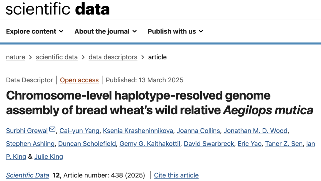 诺丁汉大学生物科学学院小麦研究中心的Surbhi Grewal团队在《Scientific Data》杂志发表题为“Chromosome-level haplotype-resolved genome assembly of bread wheat's wild relative Aegilops mutica”的论文,揭示了小麦野生近缘种Aegilops mutica(2n = 2x = 14;T基因组)的染色体级别、单倍型解析的基因组图谱,为小麦育种提供了宝贵的遗传资源。