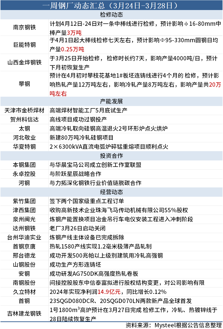 据Mysteel不完全统计,本周(3月24日-3月28日)4家钢厂发布检修信息,具体如下: