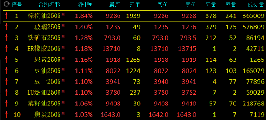 早盘开盘,国内期货主力合约涨跌不一。棕榈油、低硫燃料油、玻璃、铁矿石、丁二烯橡胶、燃料油、焦炭、豆一、菜油、尿素涨超1%。跌幅方面,集运指数(欧线)跌超1%,沪锌、菜粕跌近1%。