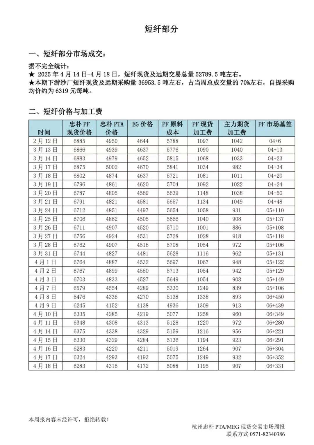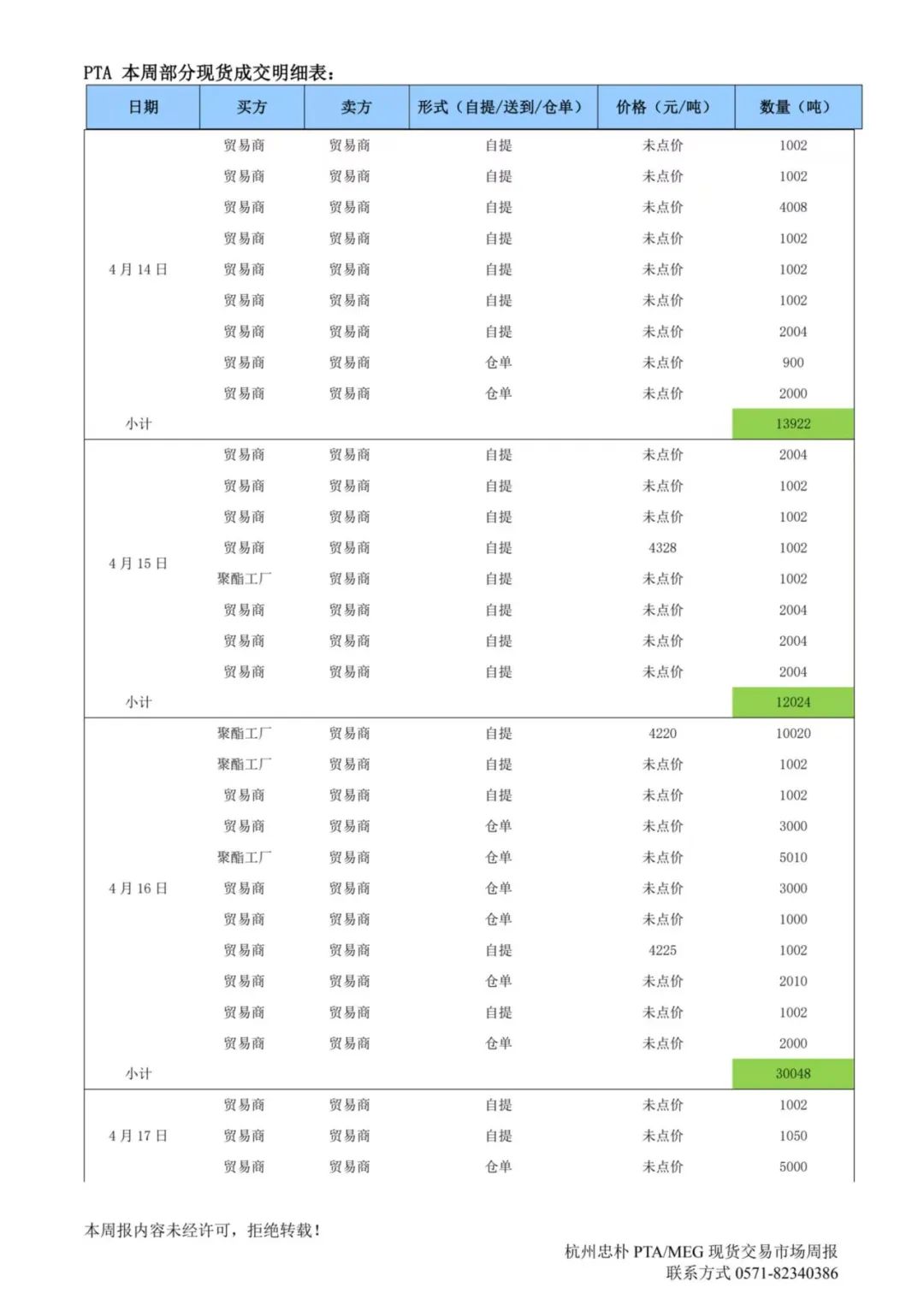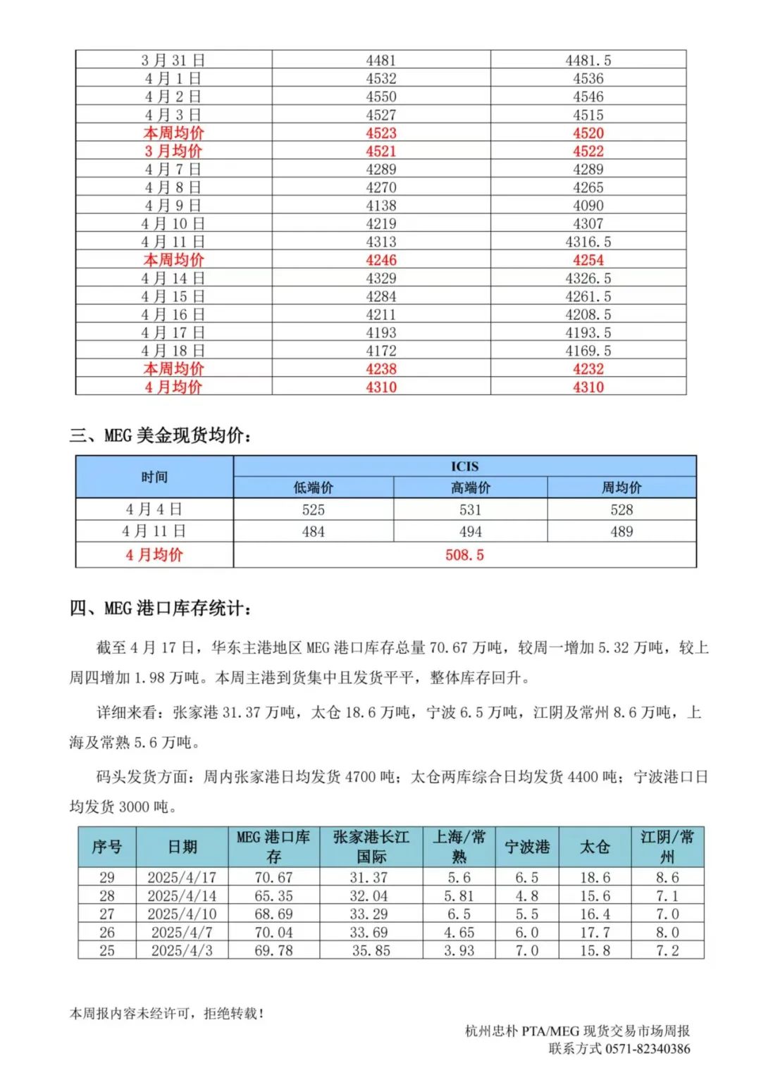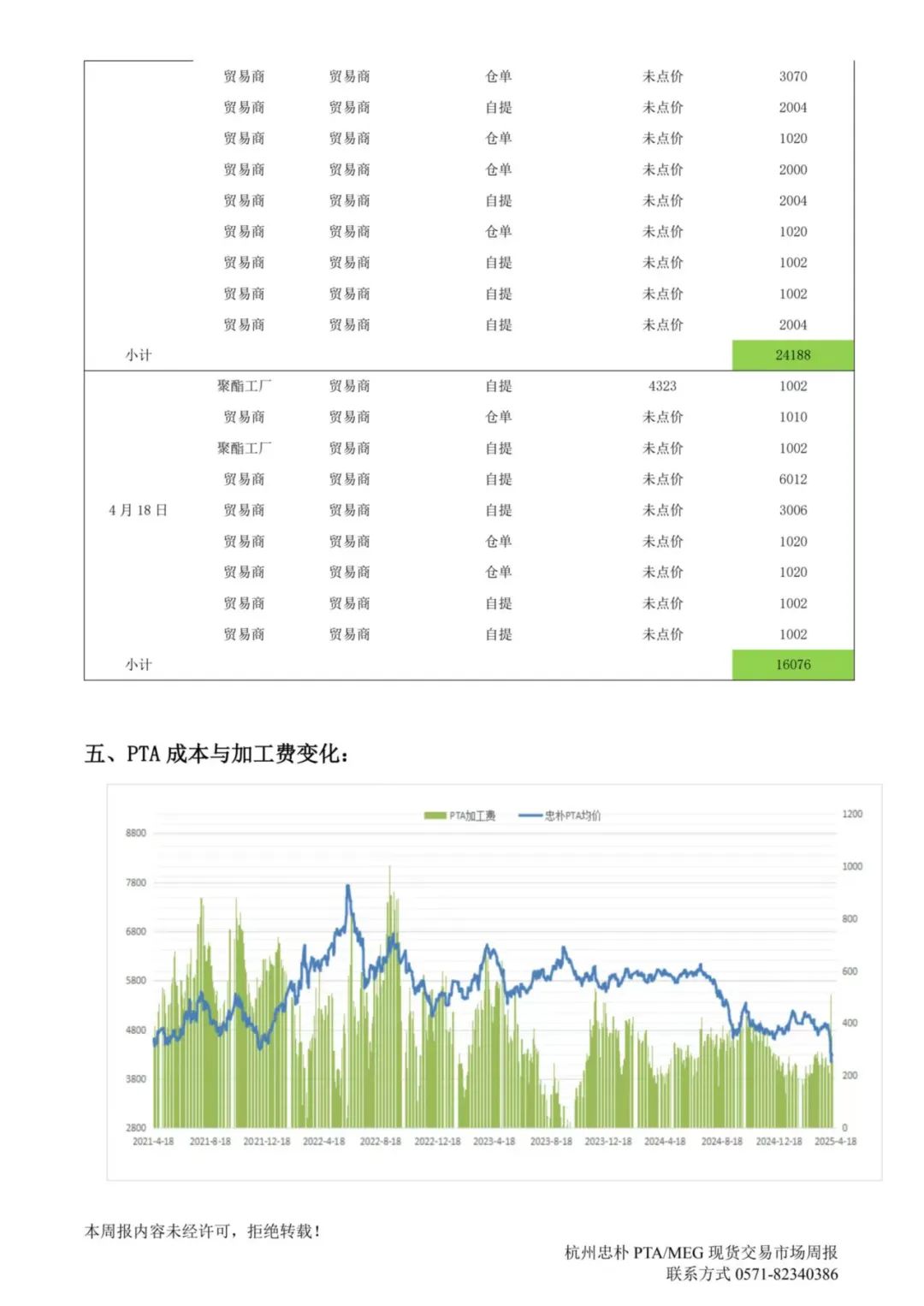 杭州忠朴PTA/MEG/PF现货交易市场周报(2025年4.14-4.18)