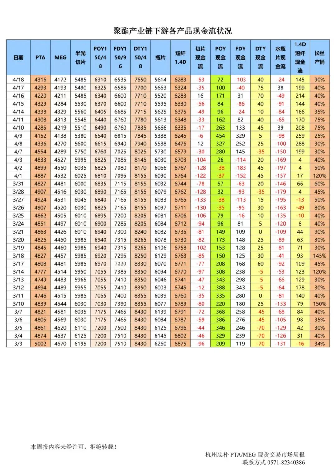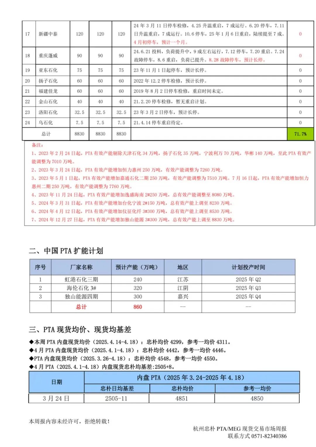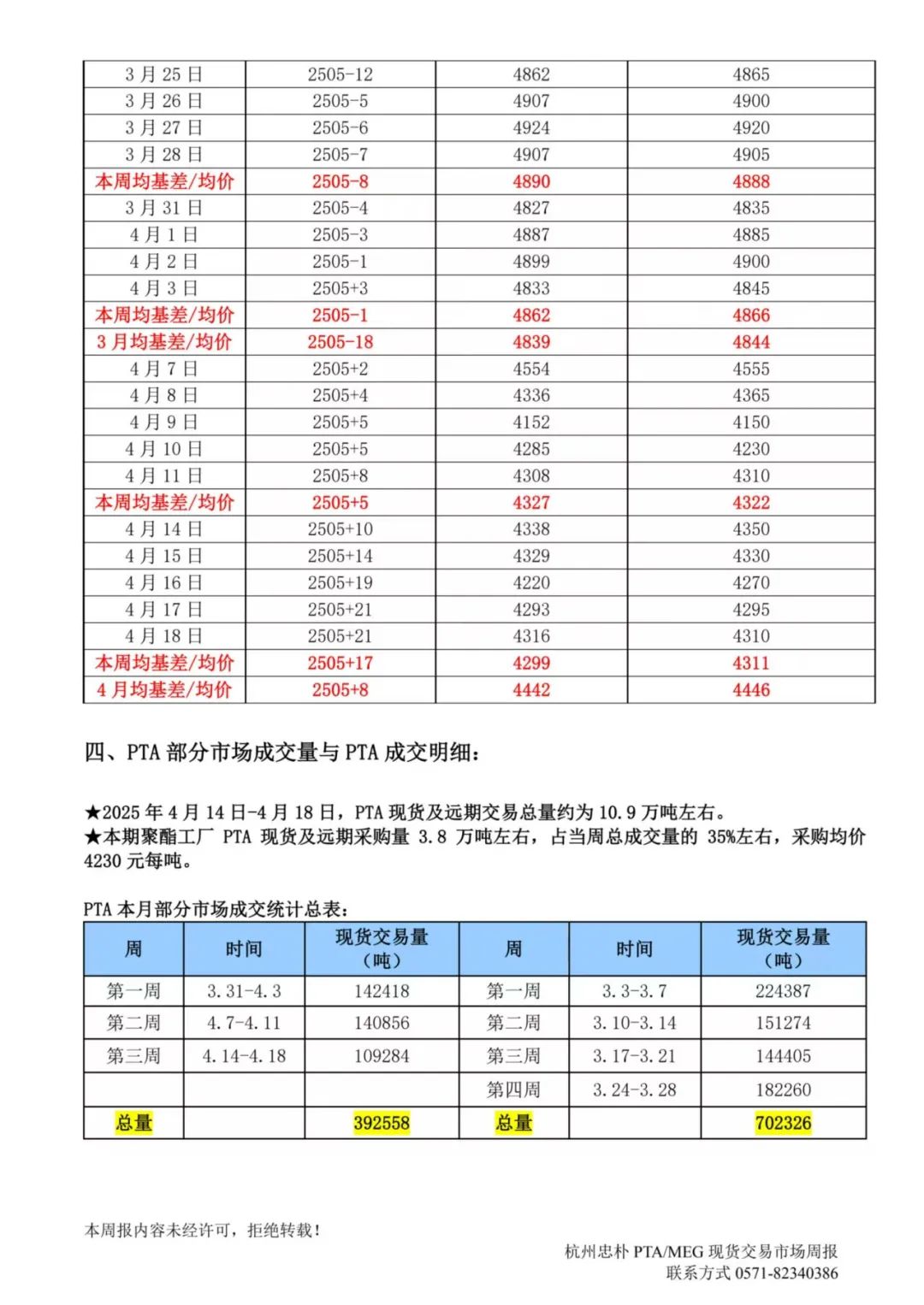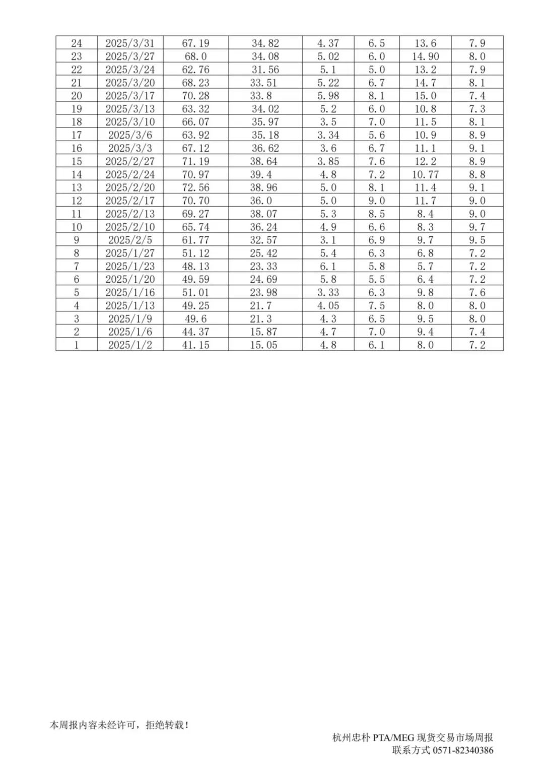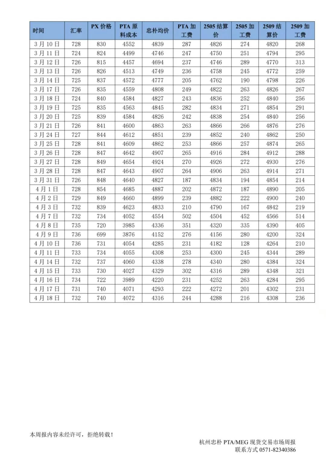 杭州忠朴PTA/MEG/PF现货交易市场周报(2025年4.14-4.18)