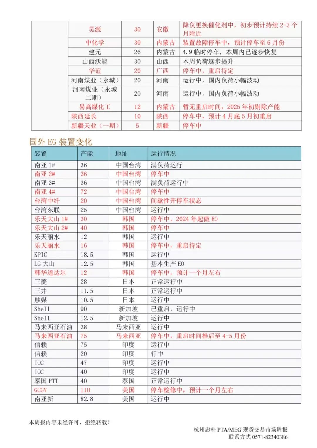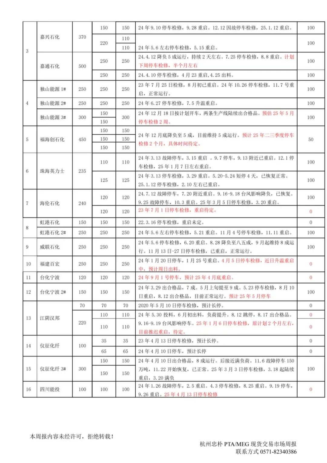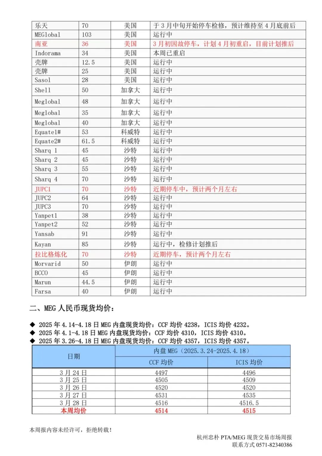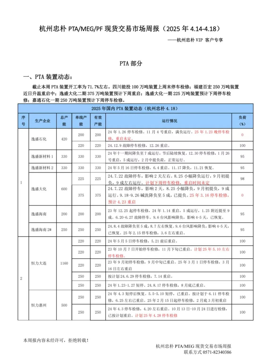 杭州忠朴PTA/MEG/PF现货交易市场周报(2025年4.14-4.18)