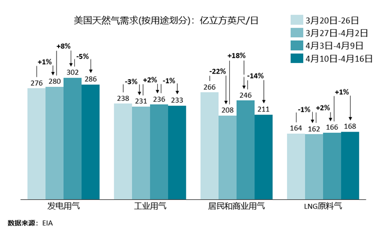 美国方面,尽管LNG船货出口量创记录,但本土天然气产量持续增加且需求走弱,叠加气温预期回升等因素,HH近月期货价格下行压力较大,周环比下降8.00%。根据EIA数据显示,4月10日-16日期间, 供应端干气产量持续增加,达1063亿立方英尺/日,较上周增加约0.47%;需求端,除LNG原料气需求小幅增加外,居民与商业用气、发电用气和工业用气均下降(详细数据如下图所示),同时,美国LNG船货出口量达到创纪录的34船,周环比涨幅约14.16%。库存方面,截至4月11日当周,地下储气库库存为18,460亿立方英尺,较上一期增加160亿立方英尺。天气方面,4月10日-16日期间,平均温度最高达约14.4℃(对比前期上升0.6℃),最低至约11.1℃(对比前期上升2.8℃)。HH近月期货结算价于上周四收于3.245美元/百万英热。