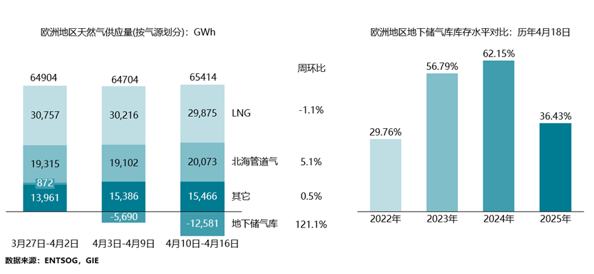 欧洲方面,补库需求大幅增加,叠加欧洲央行降息落地,宽松的货币政策对能源价格形成看多预期,TTF近月期货价格结束连续三周下跌,周环比上升6.56%。根据ENTSOG数据显示,4月10日-16日期间,地下储气库注气量大幅增加,LNG供应量小幅下降,但北海管道气供应量上升(详细数据如下图所示)。根据GIE数据显示,截至4月18日,欧盟天然气库存为整体储气能力的36.43%(较前期增加1.33%), 低于2023-24年同期水平。新华社法兰克福4月17日电,欧洲中央银行17日宣布,将欧元区三大关键利率分别下调25个基点。这是该行自去年6月以来第七次降息。TTF近月期货结算价于上周五收于35.657欧元/兆瓦时。