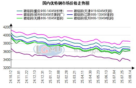 14日国内优特钢市场价格小幅趋弱运行,据兰格钢铁云商平台监测数据显示,国内重点城市45#碳结钢85mm平均报价3652元,较上一交易日下跌12元;40Cr合结钢85mm平均报价3817元,较上一交易日下跌12元。主要主导城市价格如下:Φ80-130mm45#杭州3630元;常州3540元;重庆3710元;天津3410元,以上主导城市较上一交易日下跌10元。