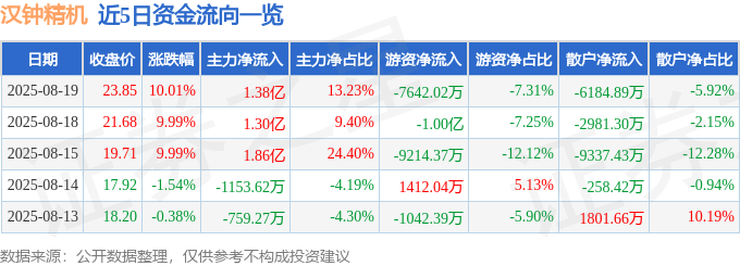 8月19日的资金流向数据方面,主力资金净流入1.38亿元,占总成交额13.23%,游资资金净流出7642.02万元,占总成交额7.31%,散户资金净流出6184.89万元,占总成交额5.92%。