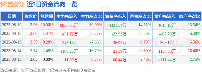 8月19日的资金流向数据方面,主力资金净流入8936.65万元,占总成交额30.09%,游资资金净流出4321.54万元,占总成交额14.55%,散户资金净流出4615.12万元,占总成交额15.54%。