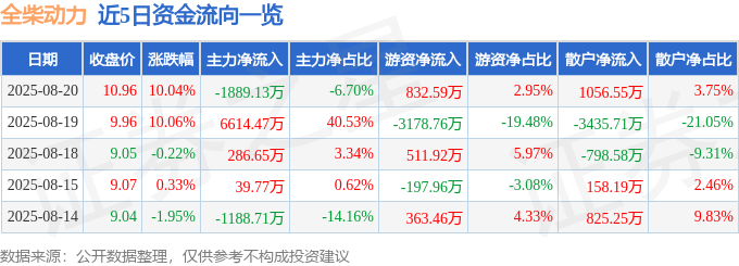 8月20日的资金流向数据方面,主力资金净流出1889.13万元,占总成交额6.7%,游资资金净流入832.59万元,占总成交额2.95%,散户资金净流入1056.55万元,占总成交额3.75%。