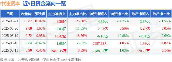 8月21日的资金流向数据方面,主力资金净流入8.36亿元,占总成交额26.3%,游资资金净流出4.69亿元,占总成交额14.75%,散户资金净流出3.67亿元,占总成交额11.55%。
