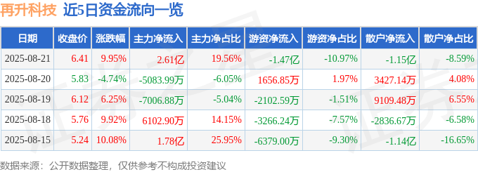 8月21日的资金流向数据方面,主力资金净流入2.61亿元,占总成交额19.56%,游资资金净流出1.47亿元,占总成交额10.97%,散户资金净流出1.15亿元,占总成交额8.59%。