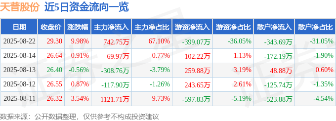 8月22日的资金流向数据方面,主力资金净流入742.75万元,占总成交额67.1%,游资资金净流出399.07万元,占总成交额36.05%,散户资金净流出343.69万元,占总成交额31.05%。