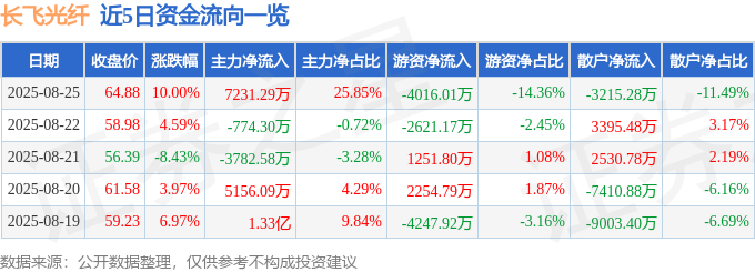 8月25日的资金流向数据方面,主力资金净流入7231.29万元,占总成交额25.85%,游资资金净流出4016.01万元,占总成交额14.36%,散户资金净流出3215.28万元,占总成交额11.49%。
