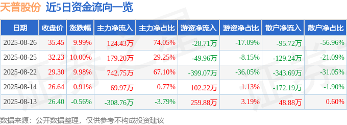 8月26日的资金流向数据方面,主力资金净流入124.43万元,占总成交额74.05%,游资资金净流出28.71万元,占总成交额17.09%,散户资金净流出95.72万元,占总成交额56.96%。