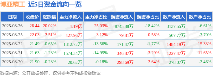 8月26日的资金流向数据方面,主力资金净流入1.19亿元,占总成交额25.03%,游资资金净流出8745.88万元,占总成交额18.42%,散户资金净流出3137.55万元,占总成交额6.61%。