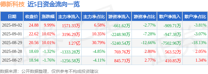 9月2日的资金流向数据方面,主力资金净流入1571.33万元,占总成交额6.58%,游资资金净流出661.62万元,占总成交额2.77%,散户资金净流出909.71万元,占总成交额3.81%。