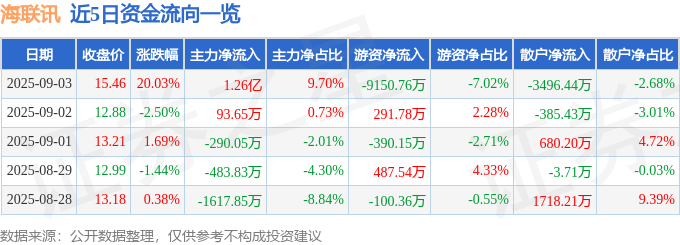 9月3日的资金流向数据方面,主力资金净流入1.26亿元,占总成交额9.7%,游资资金净流出9150.76万元,占总成交额7.02%,散户资金净流出3496.44万元,占总成交额2.68%。
