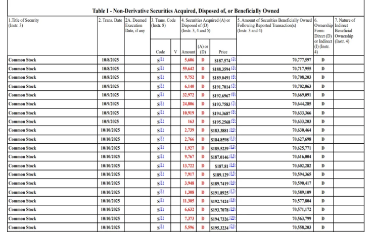 证券交易委员会(SEC)披露的最新文件显示,英伟达CEO黄仁勋在近期开启密集减持动作。其中,10月8日至10日短短3天内,黄仁勋通过20笔分散交易售出22.5万股英伟达股票,平均每股成交价格约190.2美元,累计套现金额约4280万美元;而在此之前的10月1日至7日,他已保持“每日减持7.5万股”的稳定节奏,连续五个交易日操作,每股成交均价区间在186.8美元至191.5美元,累计套现超7024万美元。