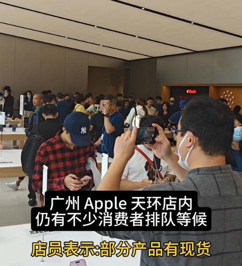 10月22日当天中午,记者看到广州 Apple天环店内有不少消费者排队等候,许多人一进门就询问 iPhone Air的展示区域,想要亲身体验这款机型的超薄手感,还有不少人当场拿出自己的手机,与iPhone Air进行直观对比。