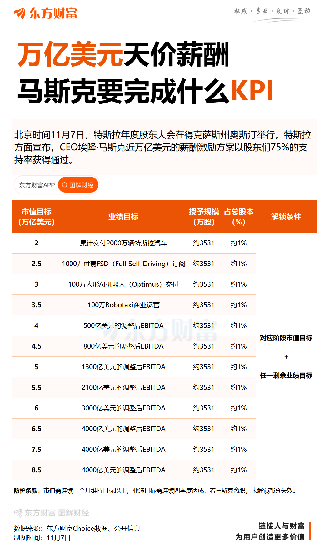 与该薪酬计划相关的其他目标包括:交付2000万辆特斯拉汽车、1000万个活跃的FSD订阅、交付100万台机器人、100万辆Robotaxi商业运营以及最终高达4000亿美元的调整后EBITDA利润。