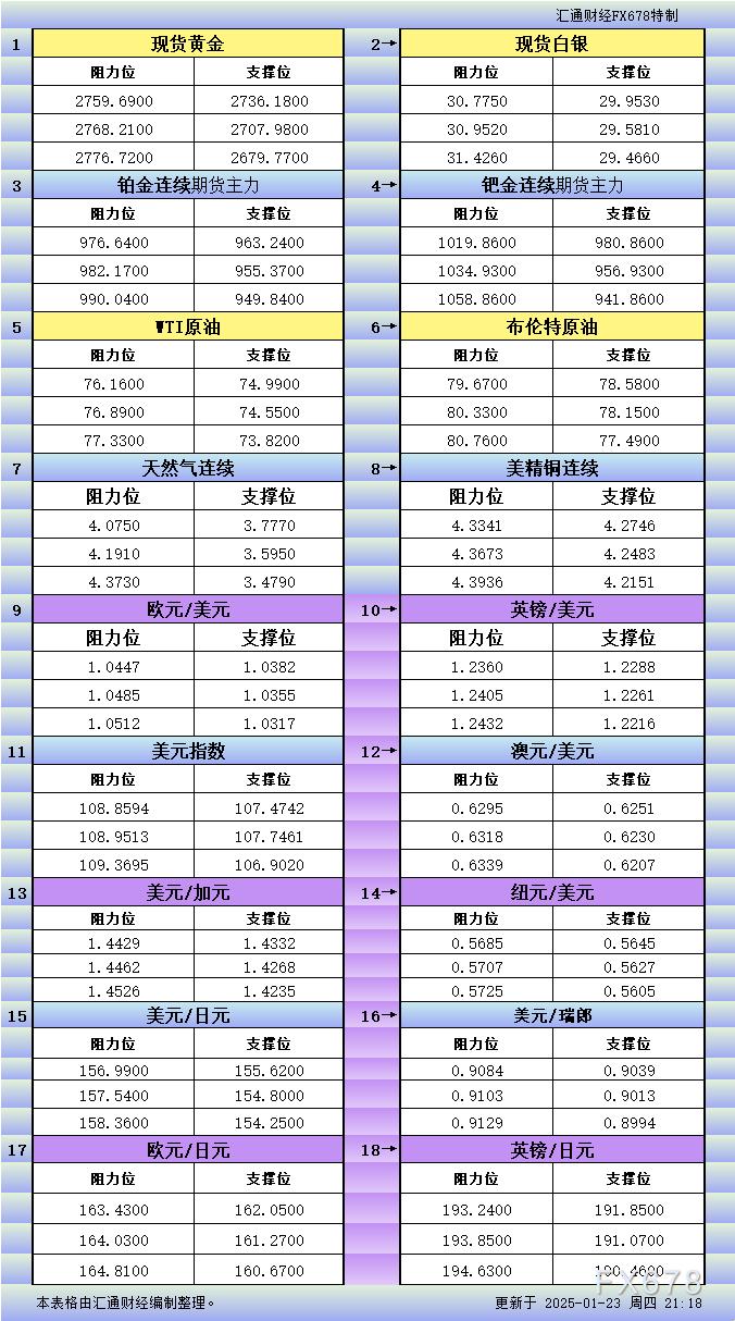 汇通财经APP讯——1月23日美市更新的黄金、白银、铂金、钯金、原油、天然气、铜(商品)以及:美元指数、欧元、英镑、日元、瑞郎、澳元、加元、纽元(热门货币对)的支撑阻力位一览。