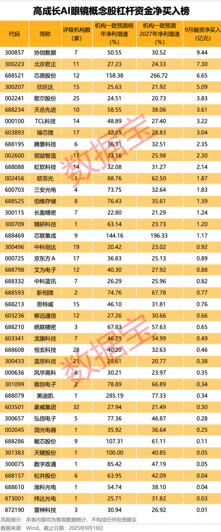 概念板块中,暗藏着杠杆资金加仓的高成长股。据证券时报·数据宝统计,9月以来,融资净买入的AI眼镜概念股中,有41股机构一致预测明年、2027年净利增速均超20%。