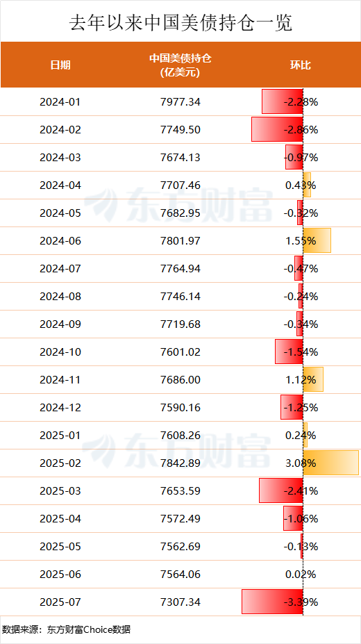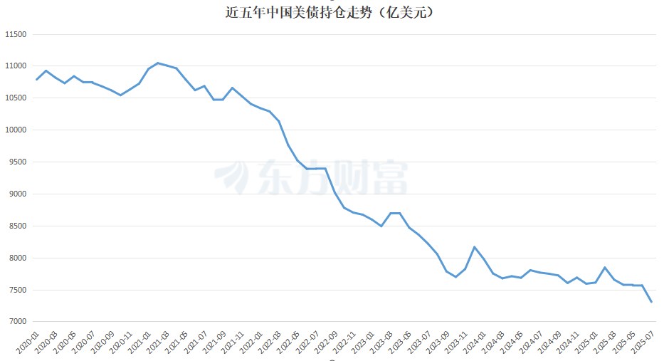 中国7月减持257亿美元美国国债至7307亿美元,为今年第四次减持。减持后,中国对美国国债的持仓规模创下2009年来新低。