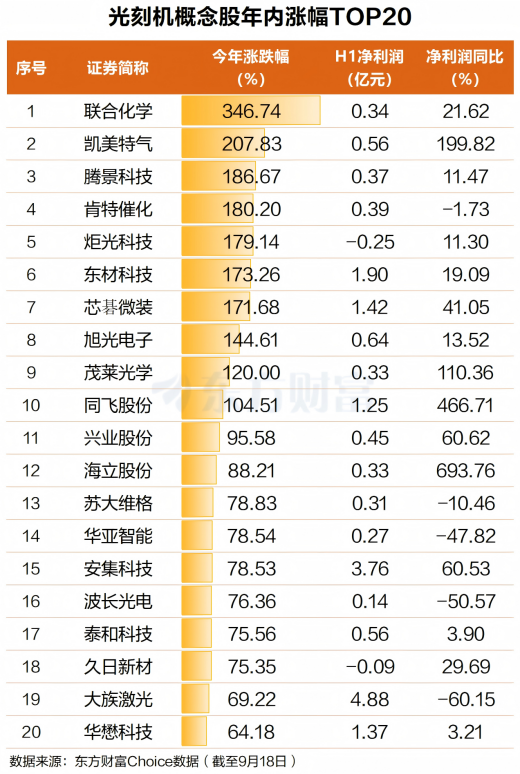 据东方财富Choice数据,截至9月18日,A股93家具有光刻机概念的上市公司中,年内股价上涨的共计89家,上涨家数占比接近96%,平均涨幅更是高达49.18%。
