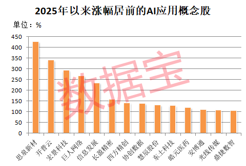 事实上,今年以来,A股AI应用领域也诞生了不少大牛股。证券时报·数据宝以AI游戏、AI医疗、AI眼镜、AI智能体、AI算力、AI玩具、AI PC等与AI应用密切相关的股票为基础进行统计。数据显示,截至9月29日,今年以来共有14只AI应用概念股累计涨幅在100%以上,包括思泉新材、开普云、宏景科技、巨人网络、信息发展等。