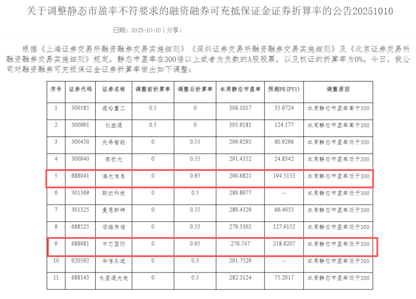 因此,10月9日,包括东方财富证券、国融证券、东方证券在内的多家券商确认将中芯国际、佰维存储、路桥信息等9只A股股票的融资融券折算统一调整为0。
