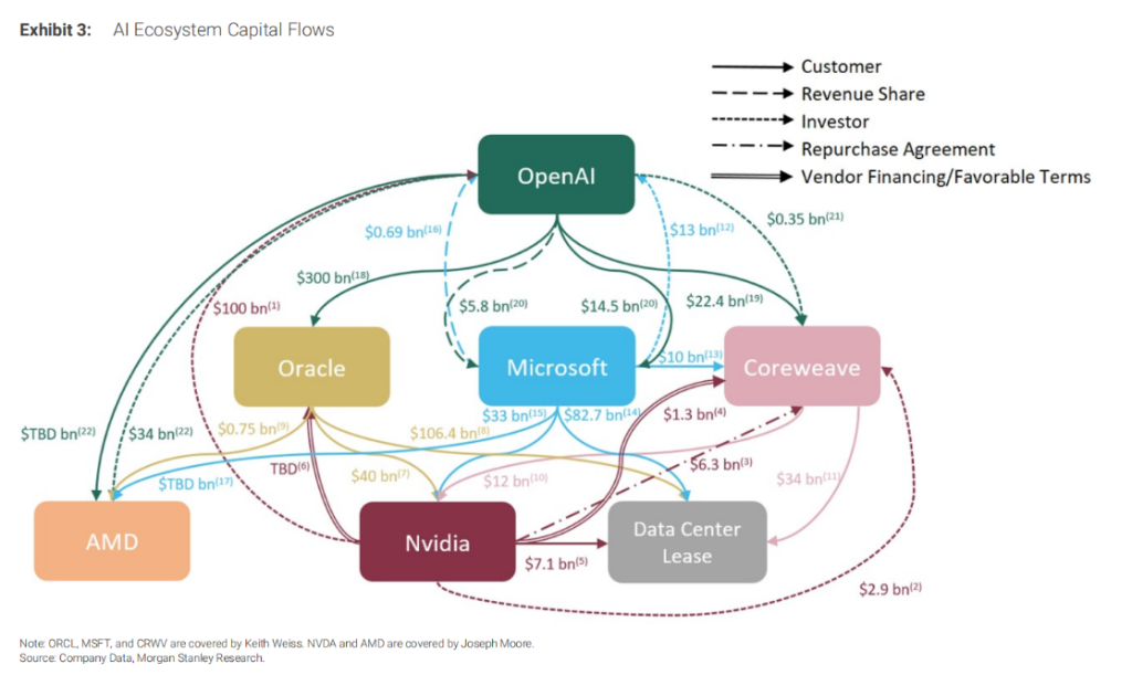 摩根士丹利在最新发布的一份报告中也梳理了OpenAI的这一AI生态系统“闭环”结构——供应商正在资助客户并分享其收入,存在交叉持股和日益集中的趋势。