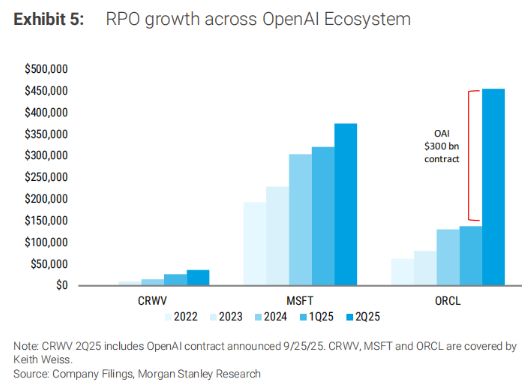 OpenAI在微软、甲骨文和Coreweave三家公司的RPO(剩余履约义务)中占据超过3300亿美元