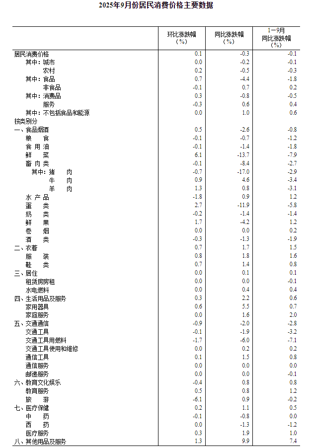2025年9月份居民消费价格同比下降0.3% 环比上涨0.1%