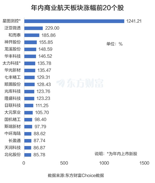 今年以来,商业航天板块震荡走强,截至10月23日收盘指数涨超40%,8月26日盘中还创出过历史新高。个股而言,商业航天板块年内有14股翻倍(含年内上市的2只个股),其中年内在北交所上市的星图测控,上市以来大涨1241.21%。泛亚微透年内上涨229%,是非次新股涨幅最大的。整体而言,商业航天板块年内的上涨中位数为24.54%。
